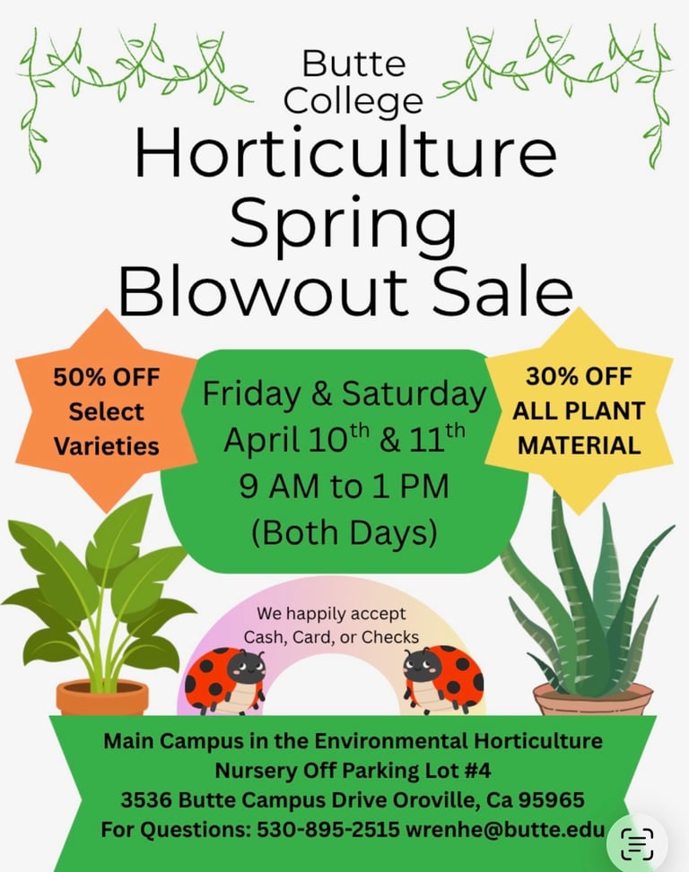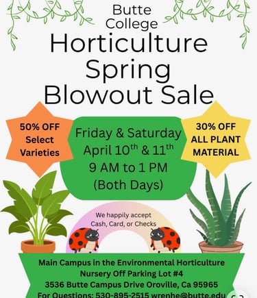 A great plant sale put on by the Horticulture Department at Buttte College. The sale is at the nursery off of parking lot #4. 3535 Butte Campus Drive, Oroville, CA 95965