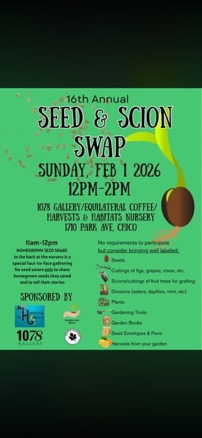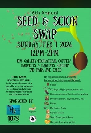 12:00 p.m.-2:00 p.m. Everyone welcome! Bring seeds and scions (plant stems to be rooted or to be grafted), cuttings, plant divisions, books, seed envelopes and harvests from your garden to share and to swap