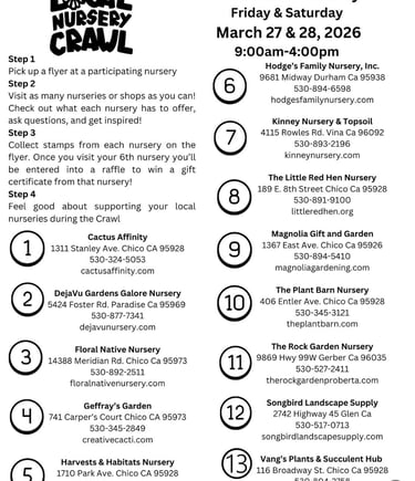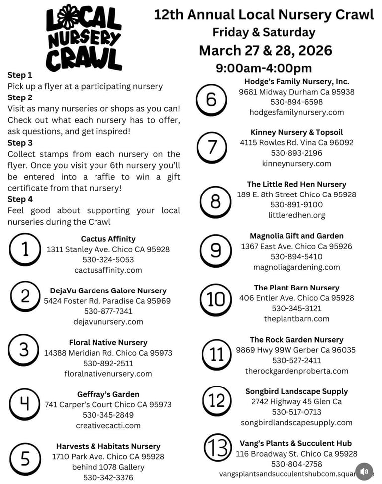 Join this fun Chico-area tradition and visit open houses and sales, plus raffles and prizes, and local nurseries! See the official flyer for more details. 🪴 🛍️